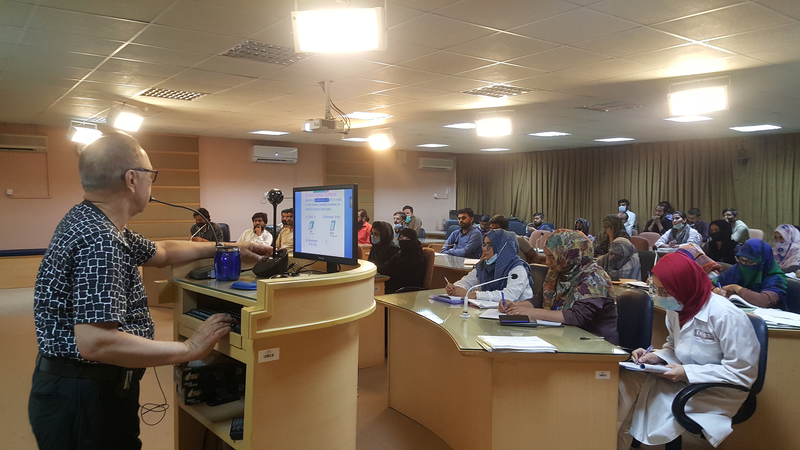 INTRODUCTION: The Sindh Innovation, Research, and Education Network (SIREN) working under the auspices of Government of Sindh and the International Center for Chemical and Biological Sciences (ICCBS), is organizing a hybrid course entitled, “Single Crystal Structure Determination of Small Molecules by XRD.” In this two credit hours course, fundamental aspects of crystallography will be explained. Lectures on symmetry, space groups, X-ray scattering, and the determination of crystal structures will be delivered. Learning Objectives X-ray crystallography is applied in the determination of molecular structures of natural products, synthetic materials, organometallic compounds, and minerals in the solid-state. In this course, fundamental aspects of crystallography will be explained. Lectures on symmetry, space groups, X-ray scattering, and the determination of crystal structures will be delivered. The participating students will be required to download the latest programs used in XRD analysis. Several demonstrations to solve the crystal structures from XRD data using the soft-wares will be conducted in the class. Test data will be provided to each student as a part of a hands-on experience that will carry some credit. Tutorials will be held on Fridays to enhance the understanding of the course content. Quizzes will be held on Saturdays. An open book/lecture notes final examination will be held after the course to determine the final grade of the participants.